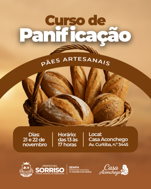 Estão abertas as inscrições para mais um curso profissionalizante: mulheres interessadas em participar de formação para fabricação de pães artesanais já podem acessar o link https://docs.google.com/forms/d/e/1FAIpQLSdAWhg7TeYqFcImIm9iJHxtQ8HYaB_osYKVMk9myE3AQ1NSmg/viewform para as inscrições. O curso será ministrado nos dias 21 e 22 de novembro das 13 às 17 horas na Casa Aconchego, localizada na Avenida Curitiba, n.º 3445. A formação é gratuita e todo o material será ofertado pela Prefeitura.