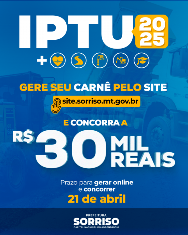 Ah, não sabe como fazer? É simples. É só acessar o site.sorriso.mt.gov.br, clicar no pop-up, ou no banner central, e seguir informando os dados solicitados. Ah! Quem optar pelo pagamento à vista, ainda tem um desconto de 20% do valor do imposto. Quem optar por parcelar, pode fracionar o pagamento em até seis vezes.