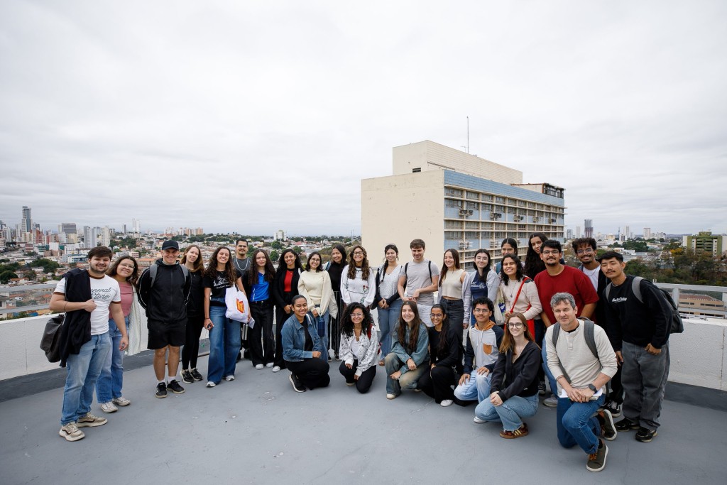 Na imagem principal, a turma com vários alunos da Universidade posa para uma fotografia em grupo no terraço do Palácio Alencastro.
