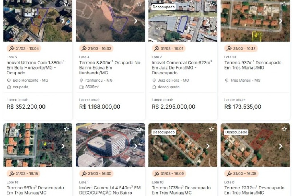 - Belo Horizonte: prédio de 4.540 m² na região central, com lance inicial de R$ 24,675 milhões; lote de 1.380 m² no bairro Gutierrez.