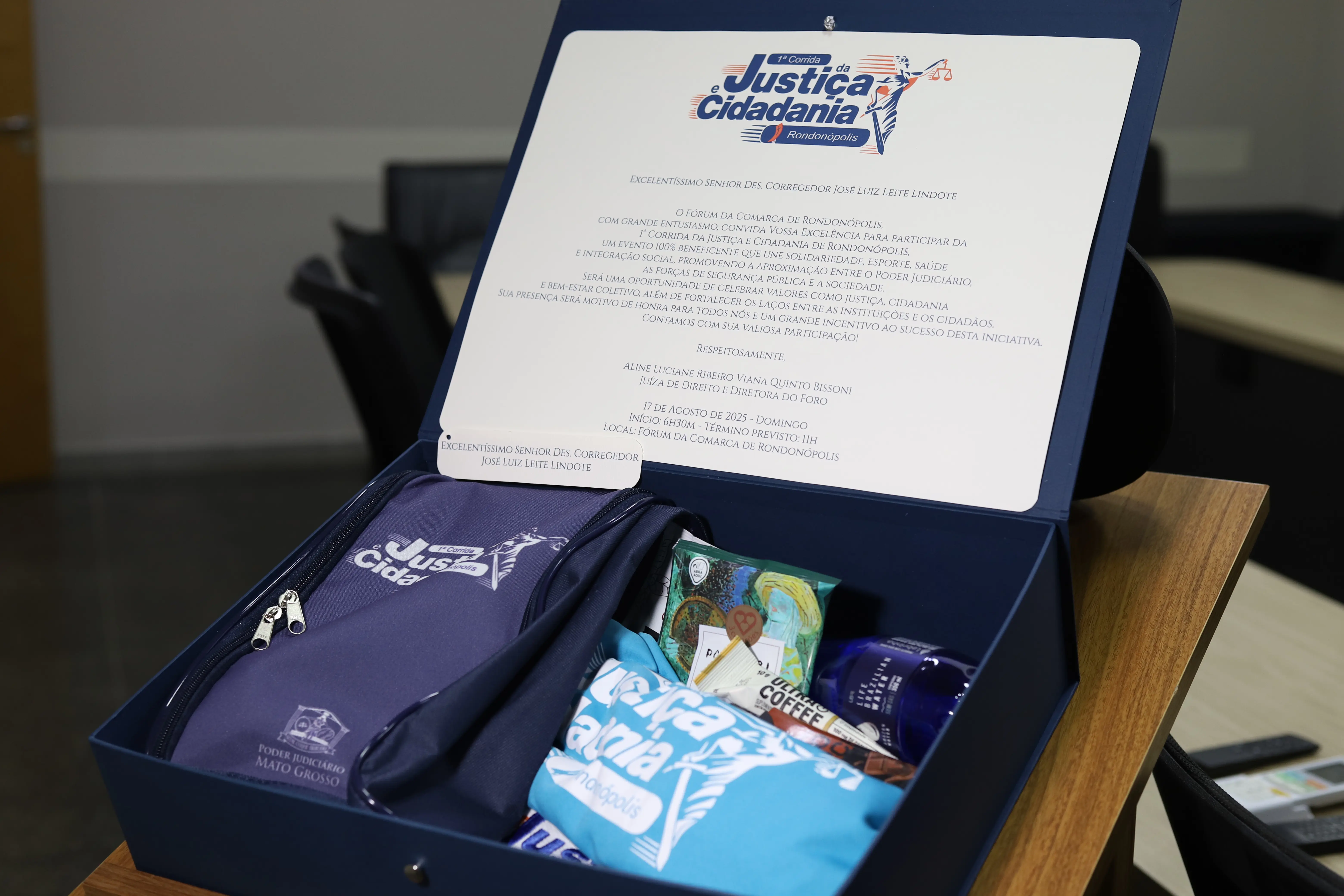 A juíza diretora do Foro de Rondonópolis, Aline Luciane Ribeiro Viana Quinto Bissoni, entregou, nesta sexta-feira (8 de agosto), o convite oficial da 1ª Corrida da Justiça e Cidadania ao presidente do Tribunal de Justiça de Mato Grosso (TJMT), desembargador José Zuquim Nogueira, à vice-presidente do TJMT, desembargadora Nilza Maria Pôssas de Carvalho, e ao corregedor-geral da Justiça, desembargador José Luiz Lindote.