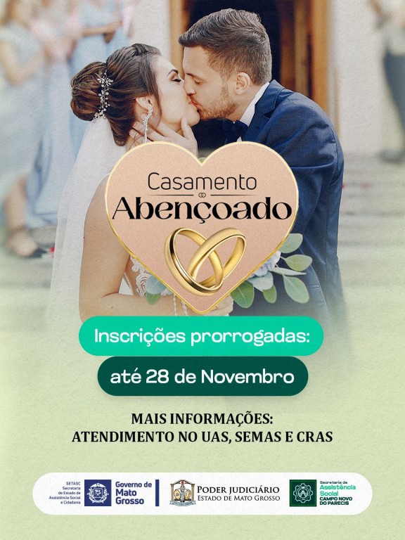 A Prefeitura de Campo Novo do Parecis, por meio da Secretaria Municipal de Assistência Social (SEMAS), informa que as inscrições para o Casamento Abençoado foram prorrogadas até o dia 28 de novembro.