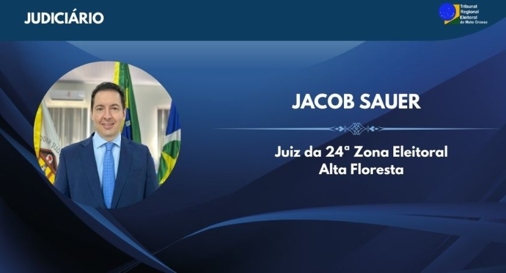 #PraTodosVerem: A imagem apresenta um card institucional do Tribunal Regional Eleitoral de Mato Grosso destacando o juiz Jacob Sauer, da 24ª Zona Eleitoral de Alta Floresta. À esquerda, há uma foto do magistrado de terno e gravata azul, com bandeiras ao fundo. À direita, em fundo azul com detalhes gráficos, aparecem seu nome em destaque e a identificação da função exercida.
