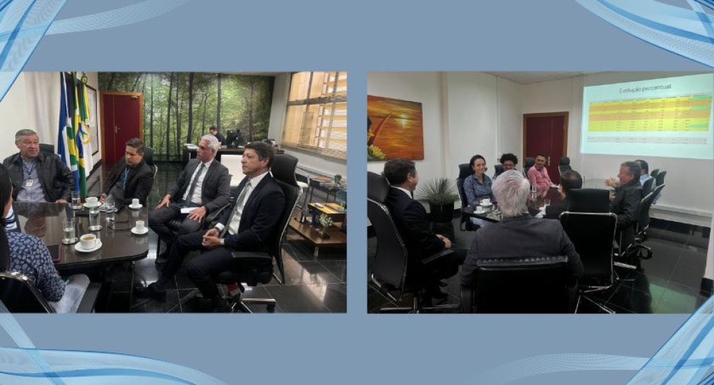 #PraTodosVerem: A imagem está dividida em dois registros de uma reunião institucional. No lado esquerdo, um grupo de pessoas está sentado em torno de uma mesa com café e água, em uma sala com bandeiras ao fundo, em ambiente formal. No lado direito, outra perspectiva mostra participantes reunidos em torno de uma mesa, observando uma apresentação projetada na parede com uma tabela de evolução percentual, sugerindo discussão de dados e resultados.