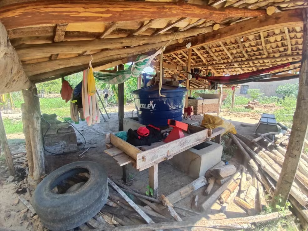 Em Magalhães de Almeida foram resgatados 76 trabalhadores que viviam em condições de abandono e miséria. O que deveria servir de alojamento eram casas de farinha desativadas, imóveis inacabados e quintais improvisados, todos sem ventilação, sem camas e sem qualquer estrutura básica. Eles dormiam em redes trazidas por conta própria, amarradas em paredes de tijolos crus, em varandas estreitas ou embaixo de árvores, expostos ao calor, à chuva e a mosquitos. A alimentação era feita coletivamente em fogareiros de chão, servida em bacias plásticas e consumida no próprio carnaubal, no chão, em pé ou encostados em cercas. O cardápio se resumia a arroz, feijão, farinha, rapadura e pequenos pedaços de carne, sem valor nutricional compatível com o esforço físico exigido. A água para beber e cozinhar era imprópria, coletada em lagoas usadas também por animais e armazenada em galões reaproveitados de produtos químicos. Sem banheiros, a maioria precisava recorrer ao mato como sanitário e a lagoas para banho, dividindo o espaço com gado e outros animais.