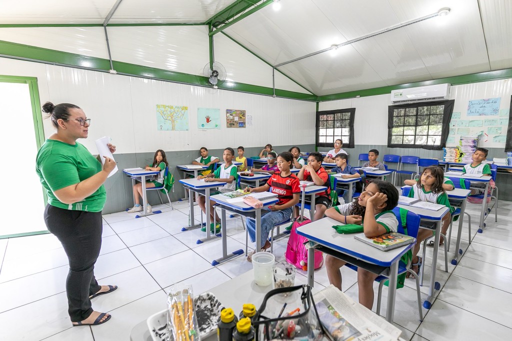 A foto ilustra a professora Karine da Silva Siqueira de calça preta e blusa verde exibindo um livre em uma sala de aula. Crianças sentadas e apoiadas em mese prestam atenção na sua fala.