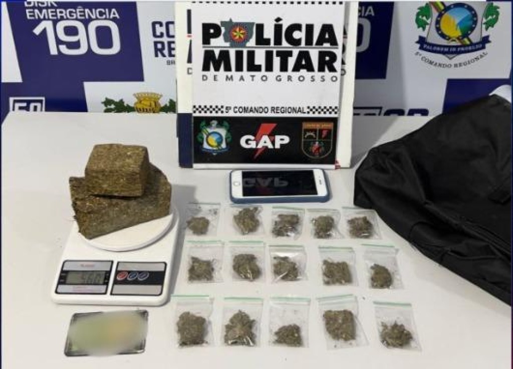 Na abordagem, foram localizados dentro da mochila dois tabletes de maconha e 15 porções da mesma droga, além de material de preparo. Questionado sobre os entorpecentes, o suspeito confirmou a posse da droga.