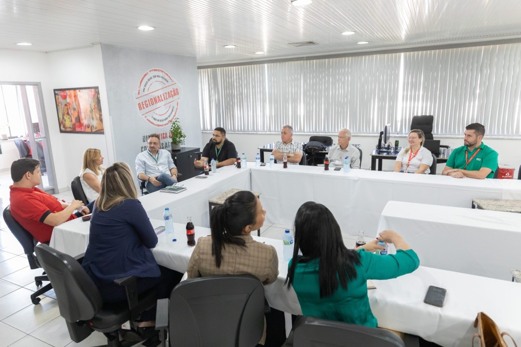 Na imagem principal mostra os secretários municipais, a diretora regional e a equipe técnica da Solar Coca-Cola reunidos durante reunião realizada na empresa. Abaixo tem uma galeria de fotos, que mostra o momento da visita.