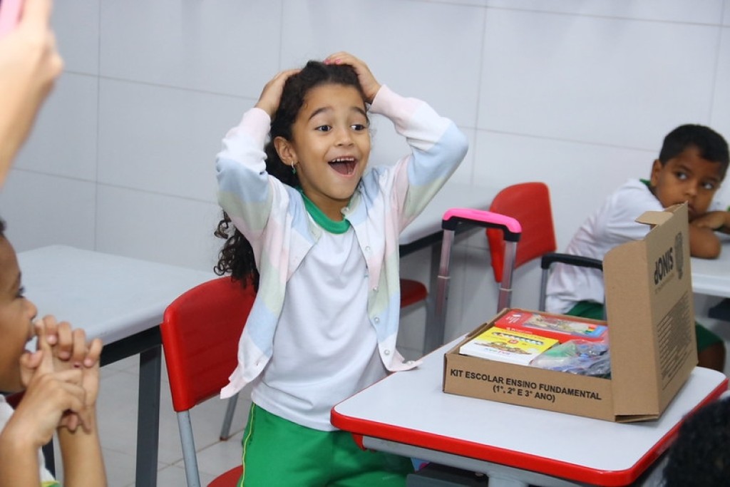A estudante Angeline Correia recebeu o kit escolar das mãos do prefeito e comemorou. “Foi muito legal. Ele falou que ia entregar as caixas de material para a gente estudar. Achei muito legal e encontrei muitos materiais na caixa”, relatou.