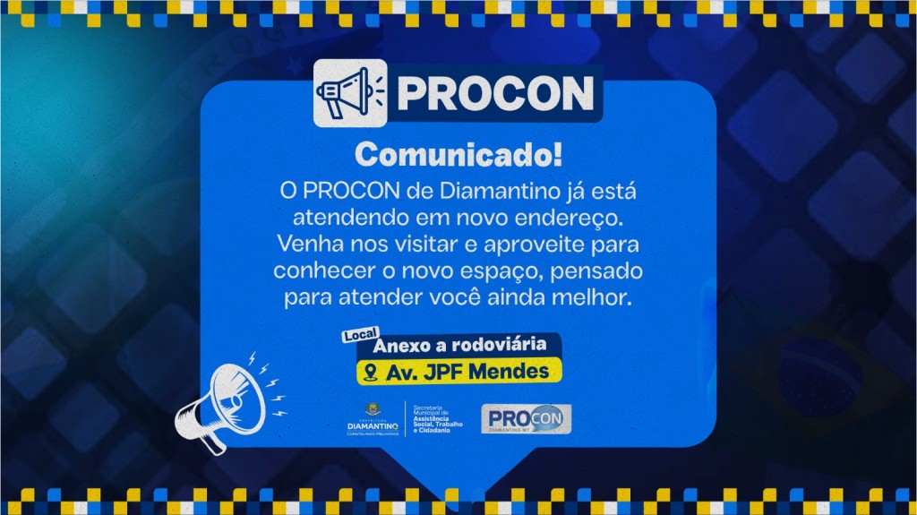 A Prefeitura de Diamantino, por meio da Secretaria Municipal de Assistência Social, Trabalho e Cidadania informa que o Procon Municipal já está realizando atendimentos em novo endereço, oferecendo mais comodidade e facilidade de acesso para a população.
