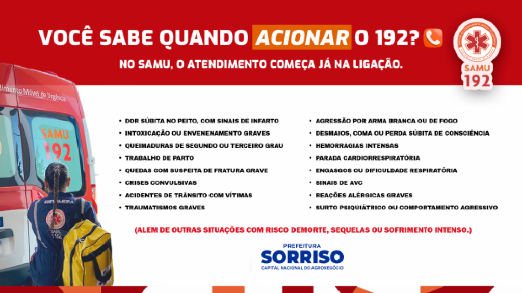 No SAMU, seu cuidado começa na ligação. A Secretaria Municipal de Saúde reforça à população a importância do uso responsável do número 192, canal direto para acionar o Serviço de Atendimento Móvel de Urgência (SAMU 192). O serviço é destinado exclusivamente a situações de urgência e emergência que possam representar risco imediato à vida ou à integridade física do paciente de natureza clínica, cirúrgica, traumática, obstétrica, pediátrica, psiquiátrica, entre outras.