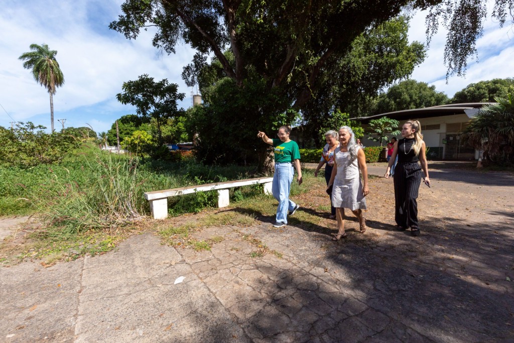 A imagem mostra a secretária de Saúde de Cuiabá, Lúcia Helena Barboza Sampaio, durante uma visita técnica em prédios de propriedade da prefeitura de cuiaba em compahnia de outros servidoras. O ambiente é aberto e apresenta muita vegetação.
