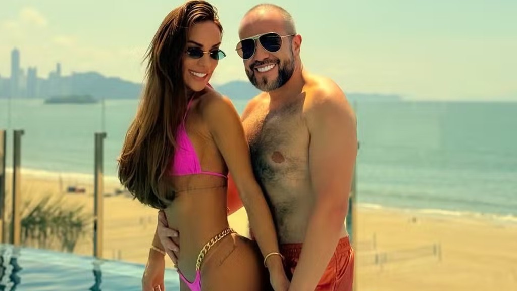 Tati Barbieri, de 37 anos, curtiu uma piscina nesta terça-feira (25), junto com o marido, o milionário russo Roman Shpigel, em Balneário Camboriú, Santa Catarina.