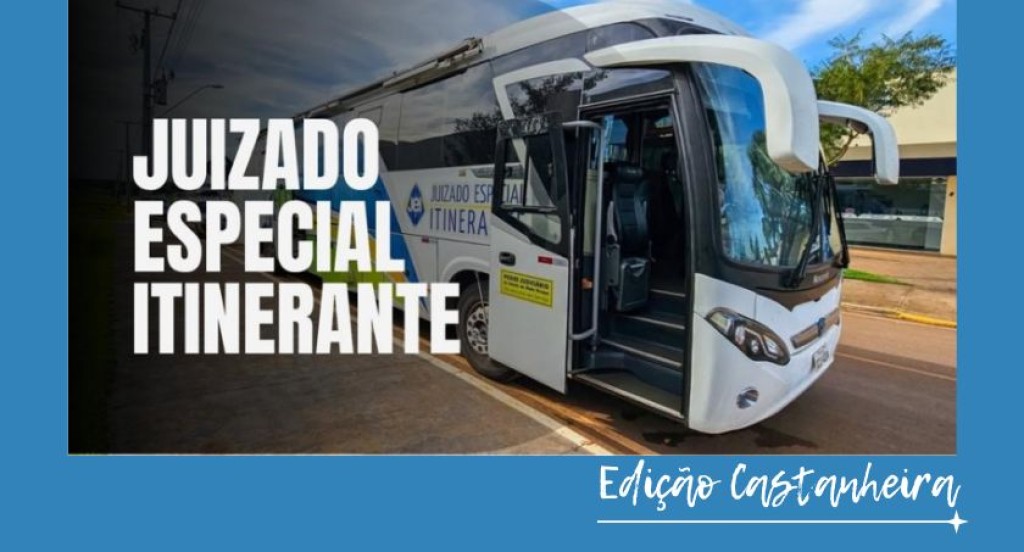 #PraTodosVerem: A imagem mostra um ônibus branco identificado como “Juizado Especial Itinerante”, estacionado em via urbana, com a porta dianteira aberta. Em destaque, sobreposta à foto, está a frase “Juizado Especial Itinerante” em letras brancas grandes, e na parte inferior direita há o texto “Edição Castanheira” em fonte cursiva branca sobre fundo azul.